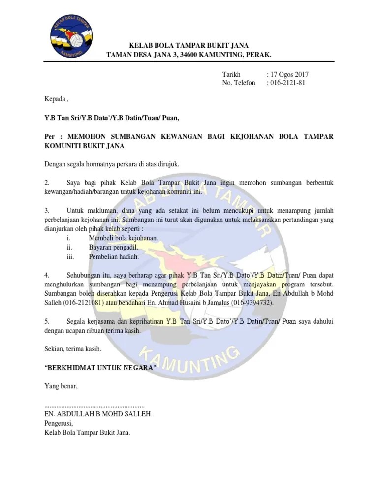 Surat memohon sumbangan daripada syarikat contoh kumpulan. Tuan,memohon sumbangan dan tajaan program gaya hidup sihat . Surat rasmi permohonan membaiki jalan fun run b dubai khalifa. Dengan segala hormat dan sukacitanya perkara di atas adalah .